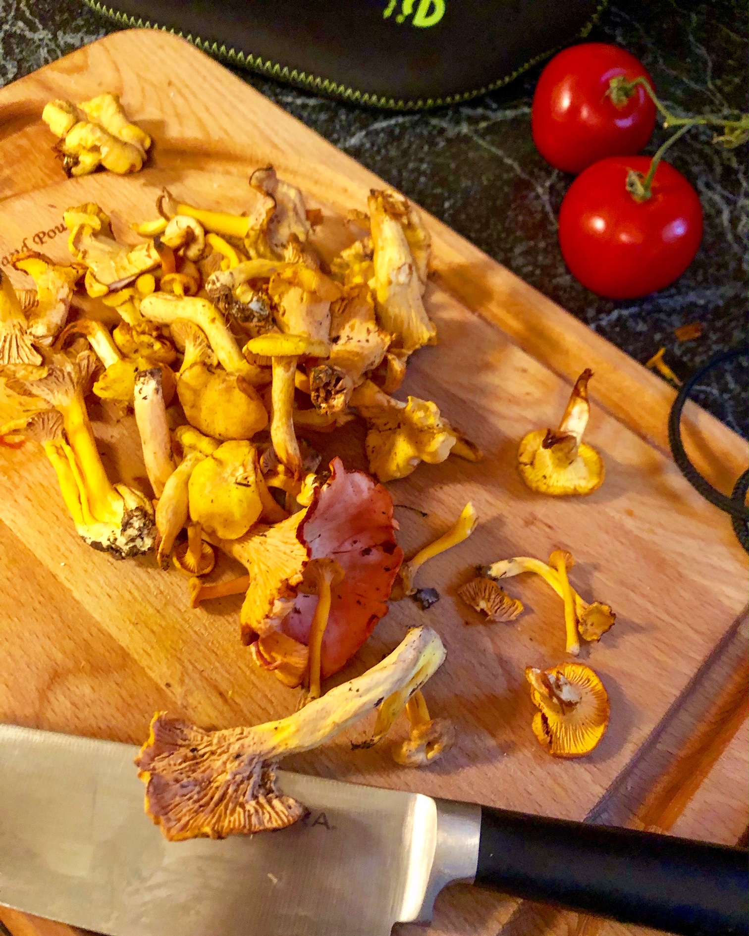 The below chanterelle recipe was inspired by a dish I recently had in Germany: chanterelle bruschetta — wild mushrooms tossed with tomatoes and basil on grilled baguette slices. Back home, we made a warm version of this to top our Independence Day burgers.