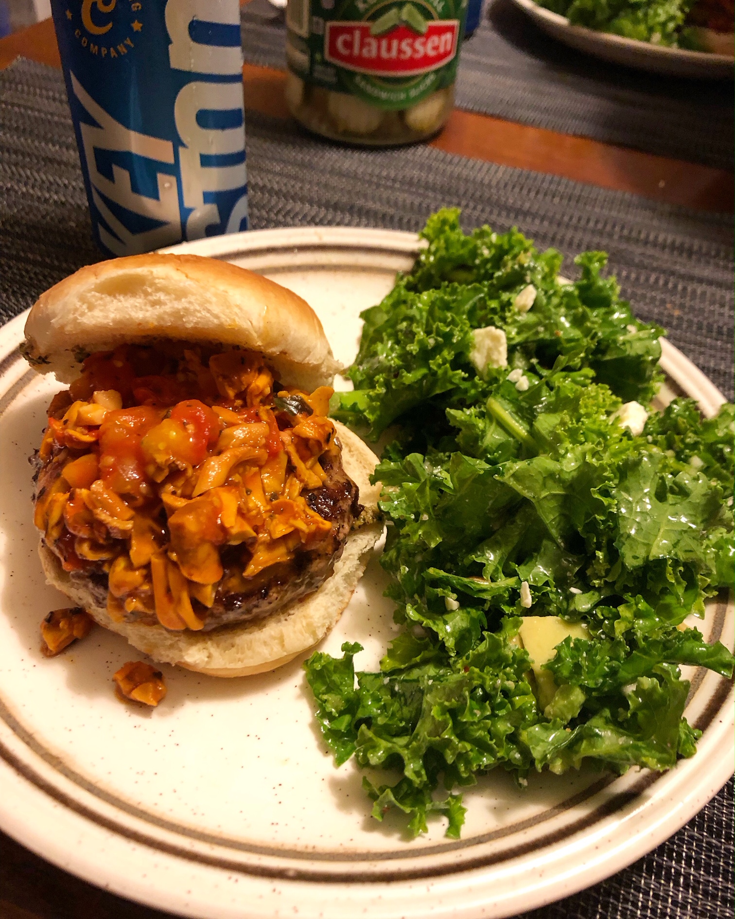 Heat olive oil in pan and toss in tomatoes until simmering. Add mushroom slices. Sprinkle in salt, basil, and oregano to taste. Serve on top of grilled burgers, warm sandwiches, or toast.